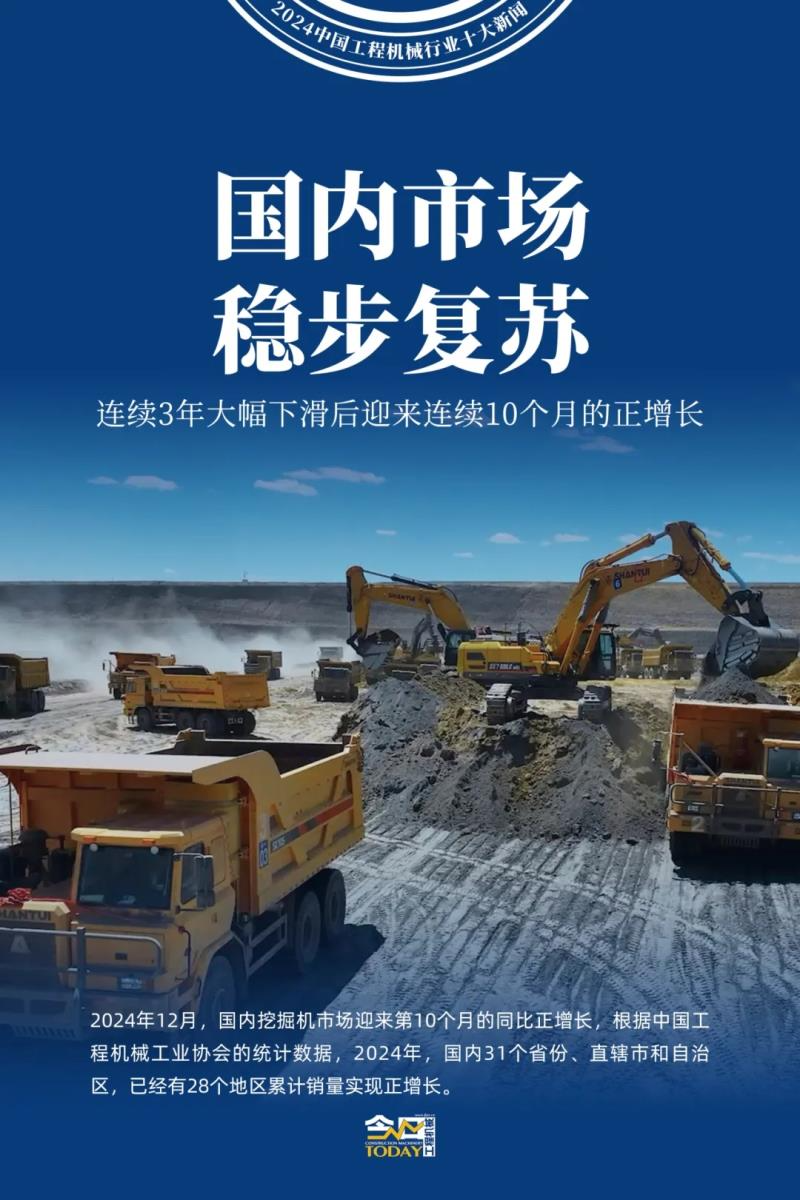 2024年12月,国内挖掘机市场迎来第10个月的同比正增长,根据中国工程机械工业协会的统计数据,2024年,国内31个省份、直辖市和自治区,已经有28个地区累计销量实现正增长。在经过了连续三年的市场大幅下滑之后,国内工程机械市场在以挖掘机、平地机和工业车辆为代表的细分品类的引领下进入稳步复苏阶段。