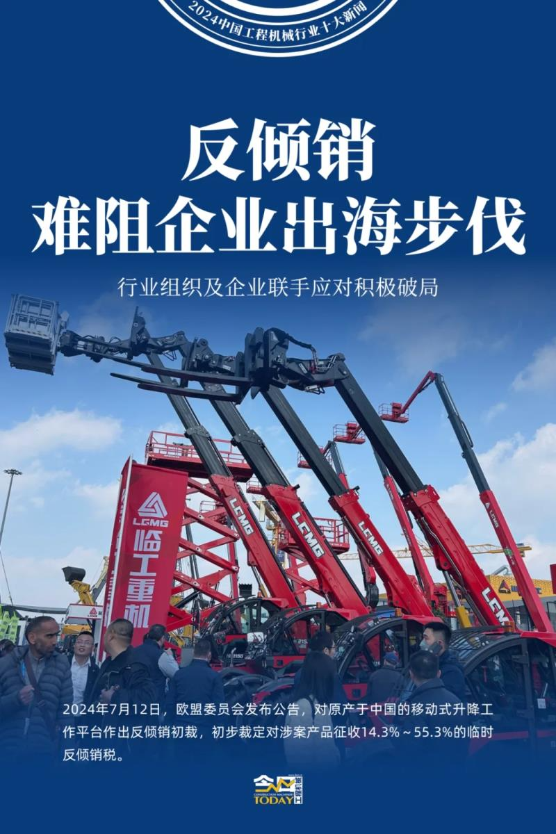 2024年6月20日,美国个人交通工具制造商联盟向美国商务部和美国国际贸易委员会提出申请,要求对进口自中国的特定低速载人车辆发起反倾销和反补贴调查。2024年7月12日,欧盟委员会发布公告,对原产于中国的移动式升降工作平台作出反倾销初裁,初步裁定对涉案产品征收14.3%~55.3%的临时反倾销税。公告发出后,各涉案企业积极应对,中国机电产品进出口商会和中国工程机械工业协会也召开联合会议,指导企业高度重视并依法合规应诉,采取独立参与“双反”调查和共同参与行业抗辩的“两条腿走路”策略,以最大限度降低反倾销对企业的影响。